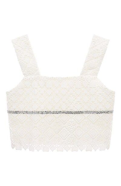 Укороченный кремовый топ делает наряднее вставка из сверкающей ленты с миниатюрными кристаллами. Для пошива модели с широкими бретелями использовали мягкое хлопковое кружево с геометрическим мотивом. Изделие, дополненное дышащим подкладом в тон, застегивается пуговицами по всей длине сзади.