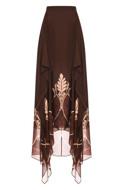 Асимметричную макси-юбку выполнили из полупрозрачной вискозы, задрапировав по бокам. Модель с контрастным графичным орнаментом застегивается потайной молнией сзади.