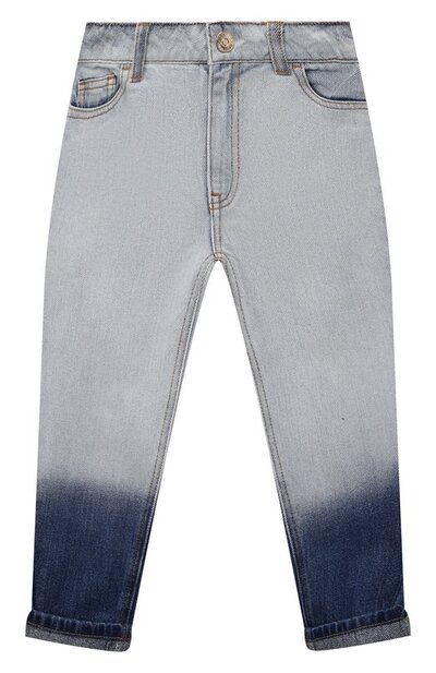 Для пошива голубых джинсов использовали мягкий прочный хлопок, который не вытягивается и не теряет форму со временем. Модель окрасили так, чтобы получить градиентный эффект, выделив края пояса и брючин более темным оттенком. Изделие прошили строчками табачного цвета, поддержав его вышивкой на кармане сзади.
