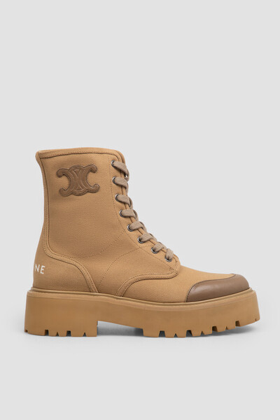 Ботинки CELINE – современная интерпретация классических дерби в духе 70-х. Модель выполнена из плотного текстиля с кожаными вставками из телячьей кожи, что придаёт дизайну выразительность и премиальную фактуру. Высокая рельефная подошва из резины гарантирует устойчивость и подчёркивает характерный массивный силуэт. Открытая перекрёстная шнуровка дополнена фирменными акцентами – тиснёным логотипом бренда на пятке и культовым мотивом Triomphe на боковой части пары. Идеальный выбор для повседневных и городских ансамблей.