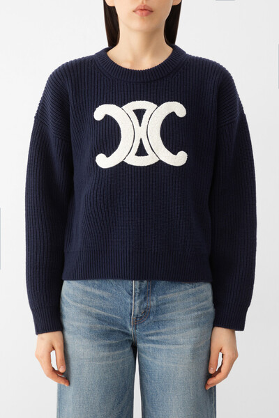 Вязаный свитер Celine интересен крупной ворсистой символикой Дома. Для производства изделия свободного широкого покроя выбрана мягкая шерсть. Спереди размещён культовый символ Triomphe белого цвета на тёмно-синем фоне. Модель, выполненная английской резинкой, сыграет роль основы для создания множества повседневных комплектов.