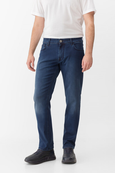 Синие джинсы Stefano Ricci зауженного силуэта от колена до щиколотки. Для изготовления повседневной модели выбран мягкий деним на основе хлопка стрейч и прочного полиэфира с эффектом делаве. Отличительными деталями являются табачная прострочка вдоль нижнего края плотного пояса и коричневый прямоугольный патч с крупной надписью-логотипом на спинке.