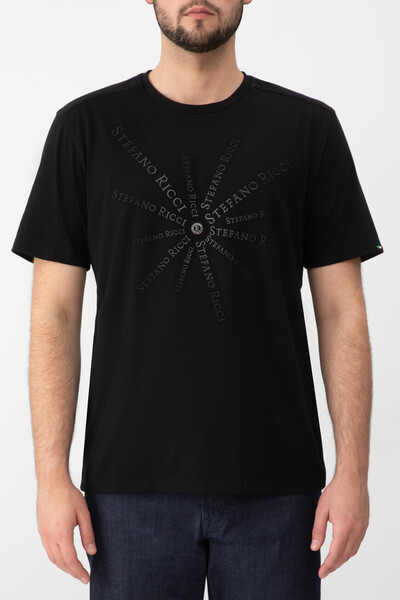 Трикотажная футболка Stefano Ricci прилегающего кроя. Модель изготовлена из мягкого хлопка и модала чёрного базового оттенка. Изделие персонализировано крупной вышивкой в виде повторяющейся надписи-логотипа с эффектом делаве и деталью-восьмигранником со вписанной в неё лого-монограммой серебристого оттенка, расположенными на груди.