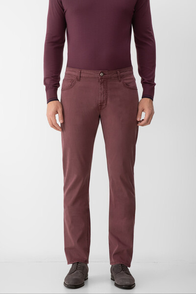Джинсы из мягкого эластичного денима от Stefano Ricci. Изделие, выполненное на основе хлопка и гипоаллергенного лиоцелла, окрашено в бордовый оттенок и оснащено застёжкой на молнию, покрытую планкой, и крупную металлическую пуговицу. На плотном поясе в задней части размещён прямоугольный патч с тиснёными головой орла и надписью-логотипом Дома в тон. Задние карманы украшает дизайнерская строчка-узор.