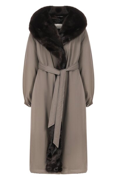 Пальто с подкладом из искусственного меха выполнили из хлопковой ткани. Модель с шалевыми лацканами, глубоким капюшоном, объемными рукавами и боковыми карманами дополнили поясом, регулирующим глубину запаха.