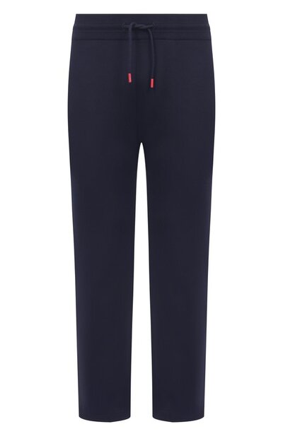 Брюки с тремя карманами выполнили из трикотажа на основе хлопка и шелка. Посадка модели регулируется шнурком с брендированными эглетами фирменного алого оттенка, продетым в рифленый пояс-кулиску.