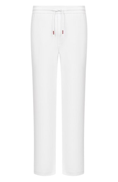Брюки с тремя карманами и имитацией ширинки изготовили из хлопкового трикотажа. Посадка модели регулируется шнурком с брендированными эглетами фирменного алого оттенка, продетым в рифленый пояс-кулиску.