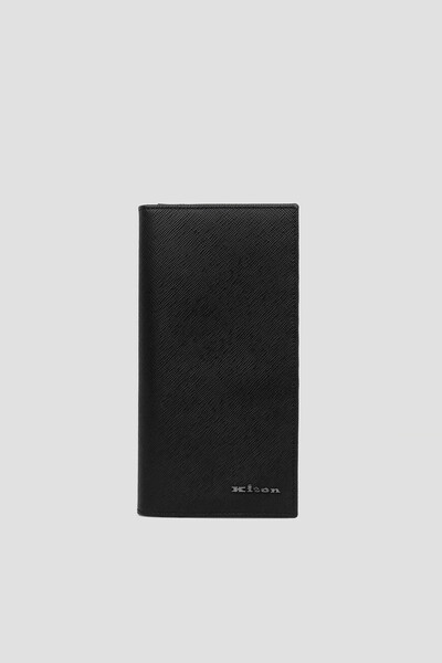Кожаная визитница Kiton с характерным тиснёным узором на поверхности. Прямоугольный аксессуар чёрного цвета интересен наличием 18 функциональных слотов для кредитных карт, одного большого отделения для купюр и четырёх дополнительных плоских отсеков для чеков во внутренней части. Роль знаковой для бренда символики передана надписи-лого из металла серебристого оттенка на лицевой стенке и тиснёному логотип слева во внутренней части модели.