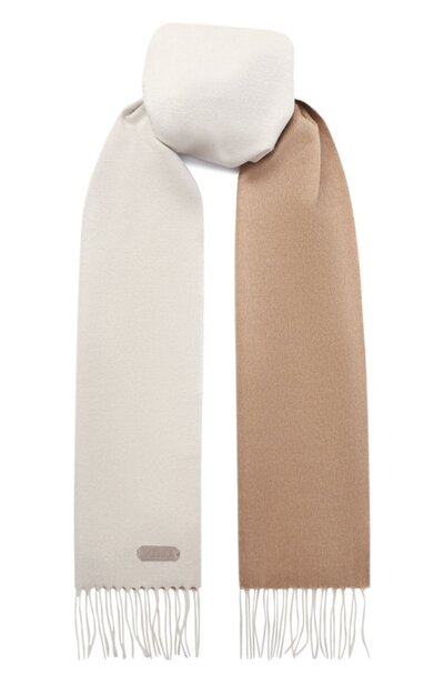 Двухцветный шарф с длинной бахромой выполнили из ворсованного текстиля на основе шелка и кашемира. Один из концов аксессуара декорировали брендированным кожаным патчем.