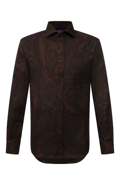 Темно-коричневая рубашка с крупным мотивом пейсли выглядит слишком неформально для офиса, зато она будет незаменима в создании повседневных образов. Например, наши стилисты предлагают носить с брюками и пенни-лоферами. Для пошива модели с отложным воротником и длинными рукавами использовали мягкую хлопковую фланель, сотканную итальянскими мастерами на традиционных станках. Ральф Лорен включил изделие в осенне-зимнюю коллекцию.