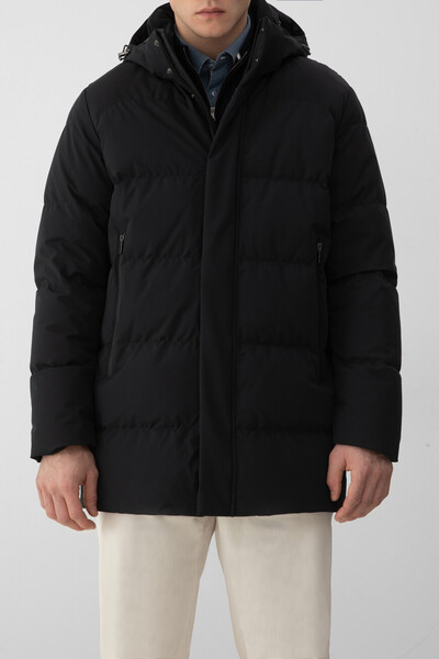 Чёрная куртка Paul&Shark, утеплённая переработанным гусиным пухом. Для создания прямой модели выбран прочный эластичный полиэфир - инновационный материал Typhoon Save The Sea с горизонтальной стёжкой. Конструкция изделия предполагает наличие высокого воротника-стойки, переходящего в глубокий капюшон на кулисках и двух брендированных клёпках спереди. Внутри - подкладка из полиэстера со стёжкой на спинке и два кармана: для телефона на молнии с технологией E.M.W. Protection — от электромагнитного излучения и крупный накладной с брендированием на клёпке.