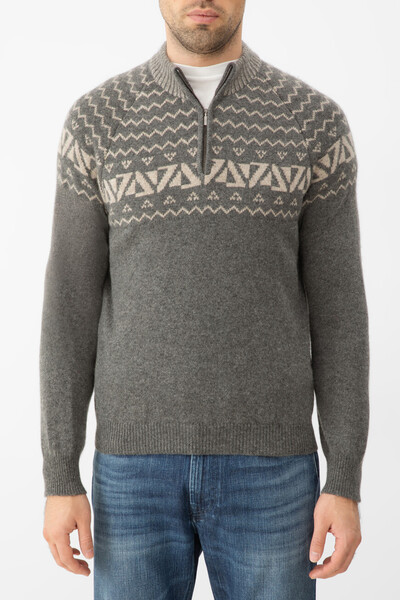 Вязаный свитер Zilli с характерной текстурой. Для изготовления изделия прямого силуэта используется серый кашемир. Воротник-стойка, создающий надёжный барьер для порывов ветра, завершается двухцветной резинкой и застёжкой-молнией с рельефной планкой. Особенностью модели стал светло-бежевый геометрический орнамент спереди и сзади в верхней части свитера.