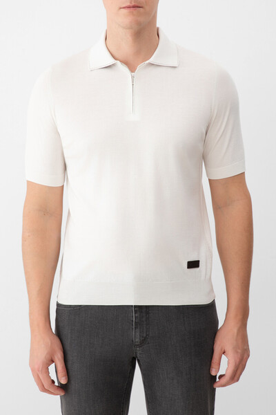 Поло ZILLI с пунктирной строчкой коричневого оттенка на отложном воротнике и боковинах. Для производства изделия прямого силуэта выбран мягкий трикотаж на основе хлопка и гладкого шёлка белого цвета. Принадлежность модели Дому обозначена гравировкой на серебристом металлическом пуллере молнии и прямоугольной нашивкой контрастного оттенка с тиснёным логотипом.