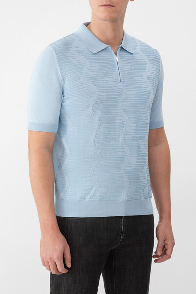 Поло Zilli из мягкого трикотажа из смеси хлопка и гладкого на ощупь шёлка. Изделие выполнено в нежно-голубом оттенке и покрыто графичным жаккардовым узором на лицевой стенке в тон. Традиционная пуговичная планка заменена молнией с брендированным металлическим пуллером.