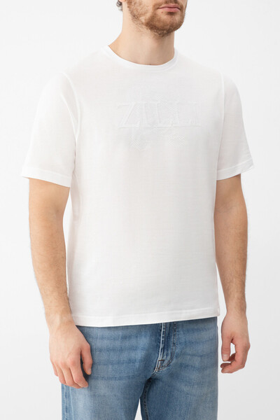 Хлопковая футболка белоснежного оттенка от Zilli. Фасон изделия характеризуется прямым кроем и наличием традиционных коротких рукавов. Роль знакового для бренда декора передана тональным вышивке в виде крупного логотипа и узору с изображением культового символа в полоску на груди.