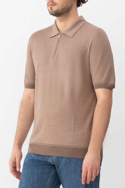Поло Zilli с широким эластичным поясом и манжетами на резинке для оптимальной посадки. Для производства изделия прямого силуэта выбран шелковый трикотаж с фактурным геометрическим узором с эффектом плетения, выполненным в тон. Планка, прикрывающая короткую молнию, изготовлена из фактурной кожи миссисипского аллигатора. Отложной воротник, манжеты и пояс обрамлены двойной полосой-окантовкой.