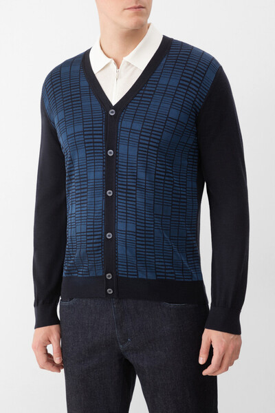Кардиган ZILLI на брендированных пуговицах спереди во всю длину. Изделие выполнено из мягкого трикотажа на основе шерсти, кашемира и гладкого шёлка тёмно-синего цвета. Модель прямого силуэта отличается синим геометрическим мотивом спереди и наличием изящного V-образного выреза. Оптимальную посадку кардигана по фигуре обеспечивают широкий эластичный пояс и манжеты-резинки.