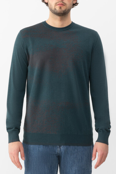 Трикотажный свитер ZILLI с традиционным круглым вырезом горловины на резинке. Для производства изделия тёмно-бирюзового оттенка выбраны мягкий кашемир и гладкий на ощупь шёлк. Передняя полочка декорирована абстрактным жаккардовым мотивом Shadows, а манжеты длинных рукавов и эластичный пояс украшают горизонтальные полосы-окантовка.