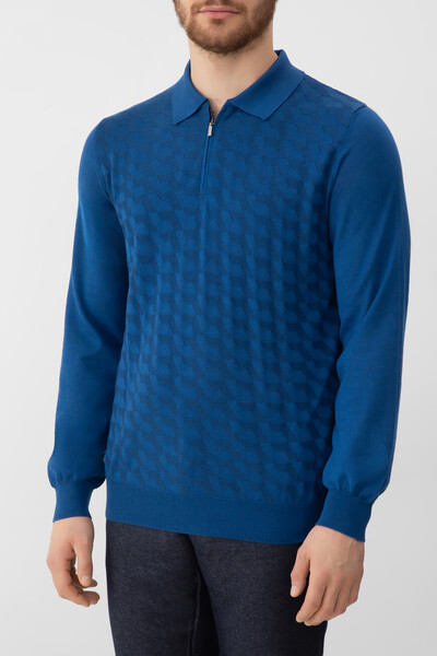 Поло из смеси мягкого кашемира и гладкого шёлка от Zilli. Изделие прямого силуэта окрашено в насыщенный синий оттенок и украшено жаккардовым геометрическим узором «Steps» с 3D-эффектом на лицевой стенке в тон. Модель застёгивается молнией с брендированным металлическим пуллером в верхней части и превосходно сочетается с джинсами из той же коллекции.