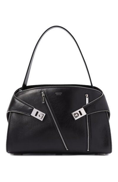 Для изготовления сумки Hug Soft со съемными ремнем и двумя футлярами использовали телячью кожу. Модель с декоративными молниями по краям, на удлиненной ручке и спереди дополнили карманами внутри и на задней панели, а также характерными для этой линии боковыми ремешками с фирменными пряжками Gancini.