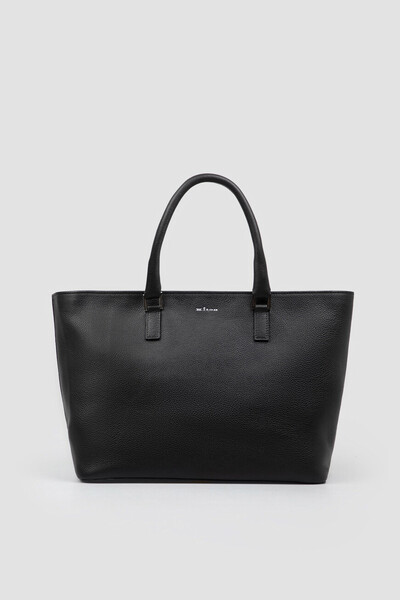 Чёрная сумка-тоут от бренда Kiton с зернистой текстурой. Для производства трапециевидного аксессуара выбрана мягкая телячья кожа. Внутри расположены одно просторное отделение на молнии и плоский карман на молнии с брендированием. Изделие оснащено двумя округлыми ручками с металлическими деталями серебристого оттенка у основания и рельефными полосами для устойчивости на дне.