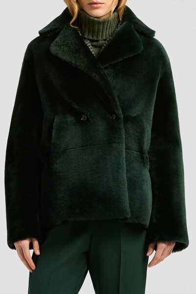 Прямая дублёнка Kiton двустороннего фасона. Для производства одной из сторон изделия выбран мягкий мех овчины тёмно-зелёного оттенка с ворсистой поверхностью, а для изготовления другой стороны - матовая кожа наппа в тон. Модель оснащена двумя прорезными карманами в боковых швах, придающими ей современный вид и обеспечивающими функциональность в холодное время года. Двубортная дублёнка застёгивается двумя крупными пуговицами.