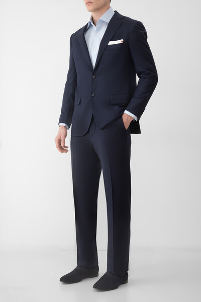Шерстяной костюм-двойка Kiton станет превосходным дополнением делового гардероба мужчины. Прилегающий пиджак и брюки с четырьмя прорезными карманами выполнены в тёмно-синем оттенке. Конструкция однобортного пиджака характеризуется наличием глубокого V-образного выреза горловины и застёжки на две крупные пуговицы. Дизайн классических брюк завершают стрелки. В комплекте идёт белоснежный платок паше с фирменной алой точкой.