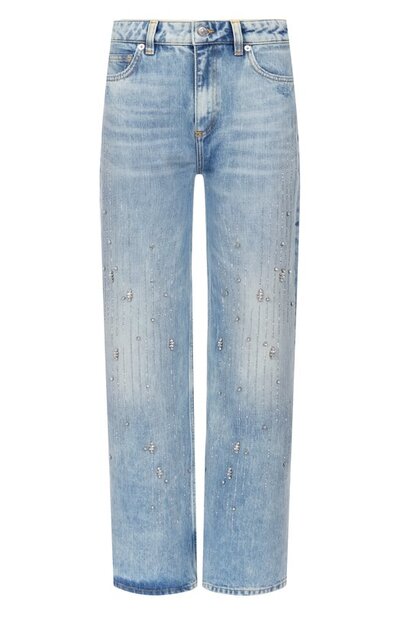 Выбеленные широкие джинсы с потертостями украсили графичным орнаментом из стразов и кристаллов. Брюки с пятью карманами выполнили из хлопкового денима.