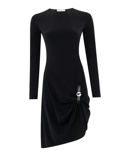 Это платье — воплощение современных тенденций в моде, сочетающее изысканную простоту и уникальные детали. Силуэт облегает фигуру, подчеркивая женственность и элегантность образа. Глубокий черный цвет добавляет универсальности и утонченности, делая платье идеальным выбором как для вечернего выхода, так и для особого случая. Длинные рукава и округлый вырез создают сбалансированное и гармоничное впечатление. Ассиметричный подол добавляет динамичности и визуального интереса, создавая эффект легкого движения при каждом шаге. Одной из ключевых деталей является стратегически размещенный драпированный элемент, закрепленный на металлическое кольцо с кожаным ремешком. Эта деталь придает платью современный и авангардный характер, акцентируя внимание на уникальности дизайна. Благодаря своей элегантности и модному крою, это платье станет неотъемлемой частью гардероба, позволяя выразить вашу индивидуальность и утонченный вкус. Оно прекрасно сочетается с минималистичными аксессуарами, подчёркивая стильную сдержанность и изысканность.