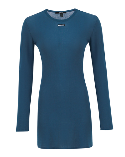 Это платье — воплощение минималистической элегантности с современными акцентами, идеально подчеркивающее изящество фигуры. Выполненное из мягкой и струящейся ткани глубокого синего оттенка, оно излучает спокойствие и утонченность. Облегающий крой создает плавные линии, подчеркивая женственные силуэты, а длинные рукава добавляют утончённости и создают баланс между открытыми и закрытыми элементами. Круглый вырез горловины сохраняет лаконичность и демократичность наряда. Детали отделки сведены к минимуму, что усиливает общее ощущение чистоты и стиля. Несколько декоративных строчек обеспечивают безупречную посадку, а небольшой логотип на груди добавляет модный акцент, отражая современную эстетику. Это платье станет универсальным компаньоном как для повседневных образов, так и для более формальных мероприятий. Оно легко сочетается с разнообразными аксессуарами и обувью, позволяя создавать различные стильные и модные комбинации.