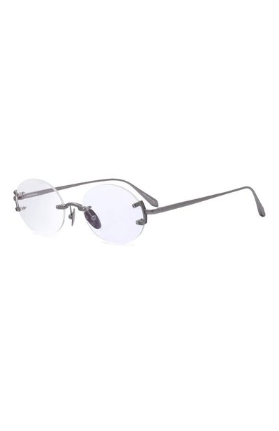 Безободковую оправу Stella изготовили вручную из легкого японского титана. Аксессуар с регулируемыми носоупорами дополнили узкими дужками с флекс-шарнирами.
