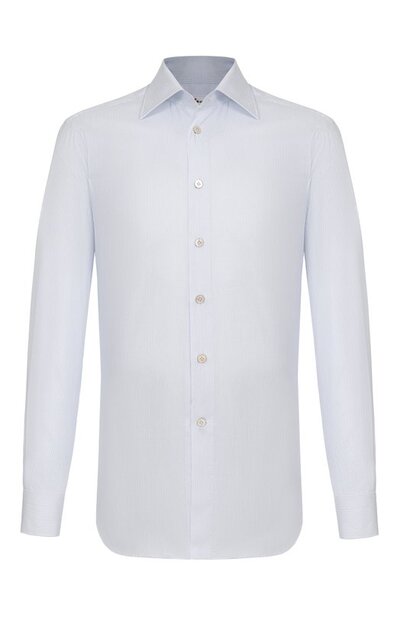 Сорочка в тонкую полоску подойдет как для повседневных, так и для формальных образов. Для изготовления модели со скошенными манжетами и воротником кент использовали ткань из чистого хлопка.