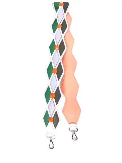 -Изделие на серебристых карабинах выполнено из кожи с разноцветными ромбами и декоративными заклепками.