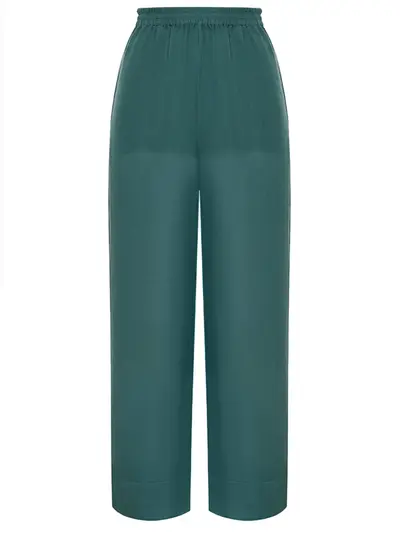 -Зеленые брюки из полупрозрачного дышащего рами от FISICO. -Модель свободного кроя с высокой посадкой, широким эластичным поясом и прорезными карманами. -Брюки дополнит топ или блуза из натуральных тканей.