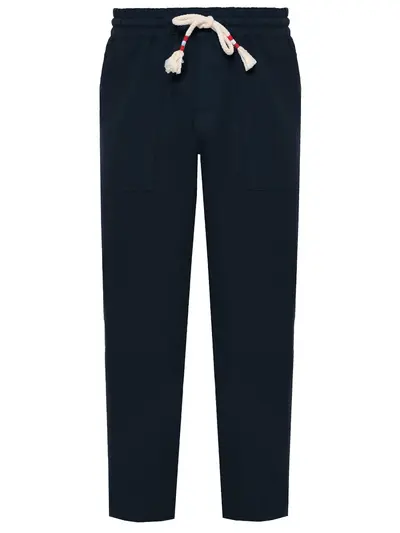-Темно-синие брюки из легкого дышащего льна от MC2 SAINT BARTH. -Модель с кроем по фигуре, стандартной посадкой, эластичным поясом на кулиске, прорезными и крупными накладными карманами, нашивкой с логотипом бренда сзади.