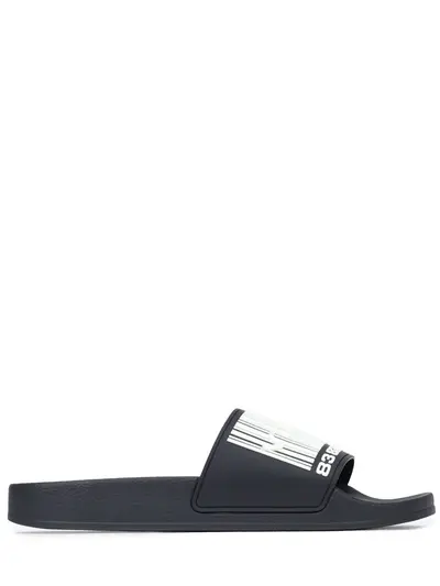 -Черные шлепанцы из легкого полимера от VETEMENTS. -Модель с округлым мысом, широкой союзкой с полимерным принтом и логотипом, анатомической стелькой, которая поддерживает свод стопы во время ходьбы, снижая нагрузку.