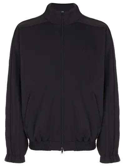 -Модель свободного кроя с длинными рукавами, эластичными манжетами и поясом на резинке, высоким воротником, прорезными карманами, застежкой на молнию с двумя пуллерами, вышитым логотипом бренда на груди, подкладом из сетки.