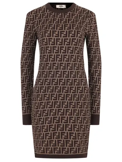 -Коричневое трикотажное платье из смесового хлопка со знаковым жаккардовым узором FF от FENDI.