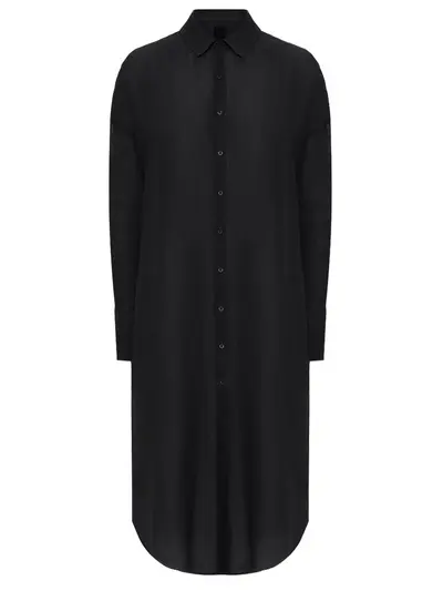 -Черная туника из полупрозрачного дышащего рами от FISICO. -Модель свободного кроя со спущенной линией плеча, длинными рукавами с манжетами, отложным воротником, застежкой на пуговицы по длине.