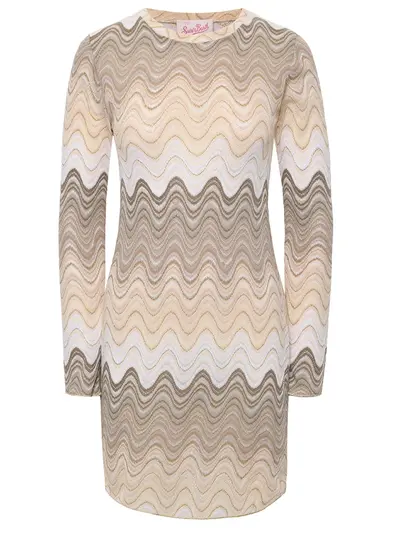 -Трикотажное мини-платье купажированного состава от MC2 SAINT BARTH. -Модель полуприлегающего силуэта с длинными рукавами, круглым вырезом горловины и люрексной нитью, которая добавляет образу лёгкие блики.