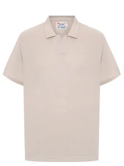 -Бежевое поло из легкого дышащего льна от MC2 SAINT BARTH. -Модель прямого кроя с короткими рукавами, отложным воротником, V-образным вырезом на груди дополнит повседневные образы с джинсами, шортами или брюками.