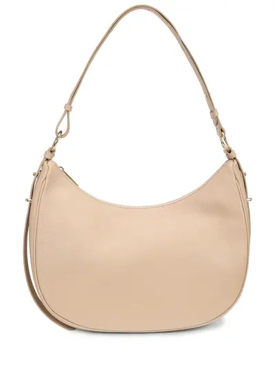 -Бежевая сумка из натуральной кожи от LANCASTER. -Модель с округлым основанием, широкой регулируемой ручкой для носки на плече или в руке, основным отделением и карманами на молниях, логотипом бренда спереди.