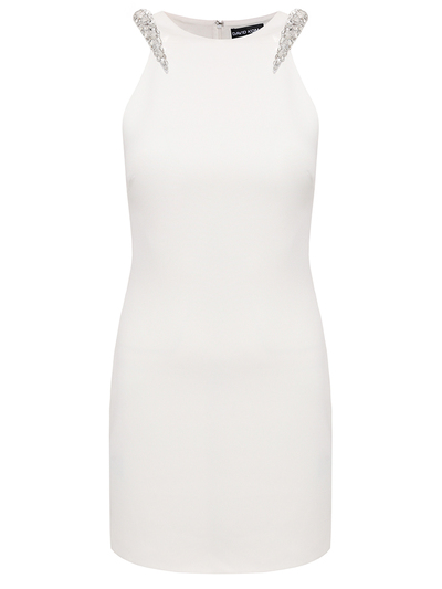 -Белое мини-платье из смесовой вискозы от DAVID KOMA. -Модель с акцентом кроя на талии и бедрах, декором из кристаллов на плечах, застежкой на потайную молнию сзади, которая не отвлекает от чистоты линий кроя.