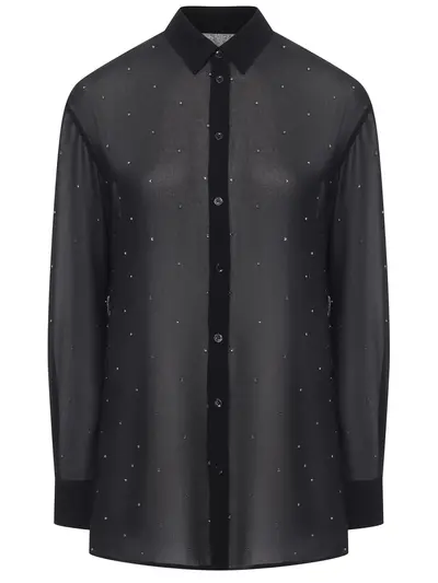 -Черная рубашка из полупрозрачной вуали от MC2 SAINT BARTH. -Модель свободного кроя с длинными рукавами, манжетами, отложным воротником, застежкой на пуговицы. -Мелкие стразы добавляют искрящиеся блики изделию.