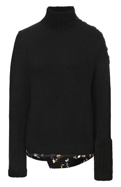 Кашемировый свитер асимметричного кроя дополнили высоким воротником и манжетами из мохера. Модель с пуговицами на левом плече отделали внизу шелком с цветочным принтом.
