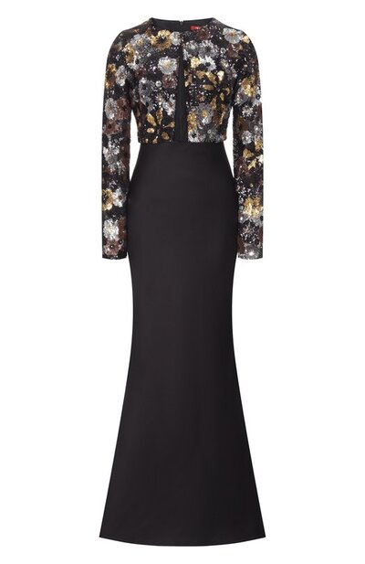 Лиф вечернего платья Lastra плотно расшили пайетками, сформировав крупный цветочный мотив, а подол выполнили из однотонного креп-сатина. Сама модель с вырезом спереди, как и манжеты, застегивается потайной молнией.