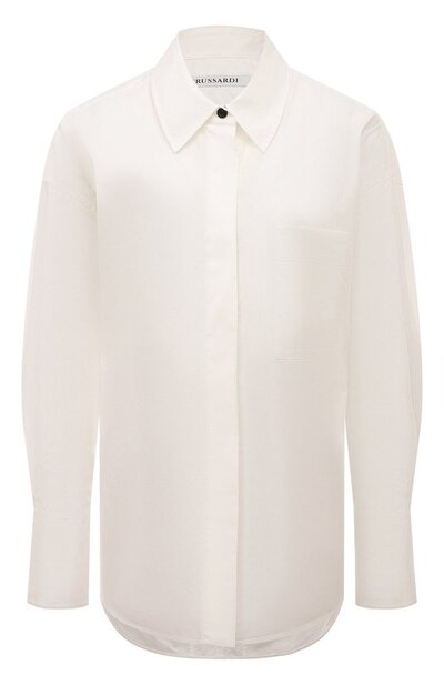 Белая рубашка выглядит так, будто ее позаимствовали в мужском гардеробе: нарочито свободный крой соседствует со спущенной линией плеч и слегка удлиненными рукавами. Для пошива модели мастера марки, основанной Данте Труссарди, использовали гладкий тонкий хлопок.