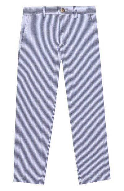 Голубые брюки в белую полоску будут хорошей альтернативой привычным джинсам. Для создания модели мастера марки использовали плотный дышащий текстиль, в хлопковую основу которого вплели волокна эластана. Благодаря такому составу изделие не вытягивается со временем. Посадку удобно регулировать пуговицами внутри.
