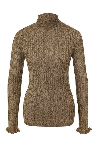 В весенне-летнюю коллекцию бренда, основанного Ральфом Лореном, вошла меланжевая водолазка с узкими оборками на манжетах. Модель изготовили в технике английской резинки из тонкой вискозной пряжи с добавлением металлизированных нитей для мягкого мерцающего блеска. Наши стилисты предлагают дополнить образ слегка расклешенными брюками со стрелками и туфлями на невысоком каблуке.