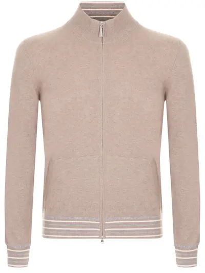 -Бежевый кардиган из кашемира от GRAN SASSO. -Полуприлегающий силуэт, длинные рукава со вставками на локтях, эластичные рельефные манжеты, пояс и ворот-стойка, накладные карманы, застежка-молния.